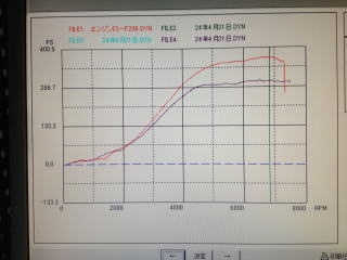 紫がフルノーマルで赤が今回の排気チューン+ECUTEK チューンです。その差80PS。後20PSは出そうですが