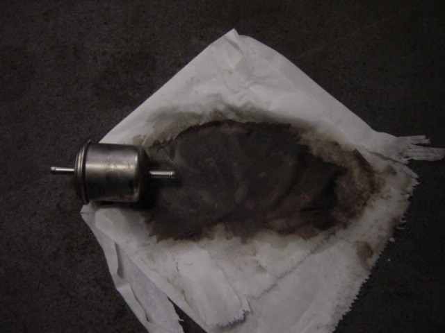 燃料フィルターは確実に詰まる物です。このフィルターを見てください。詰まりに詰まったフィルターは燃圧をも下げてしまう程抵抗になっています。カスタムされたお車は3万キロ程度で交換することをお勧めします。燃圧ドロップは即トラブルですね。メンテナンスをしっかり行えばそうそうトラブルは出ないものです。