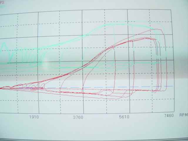 ○このグラフがバルタイ変更しながらのパワーチェックです。赤いグラフを見て下さい。これがパワーグラフです。低いグラフが適正でないバルタイで入庫した状態。点火時期、燃料等何度セッティングしてもパワーは上がりません。そして大きく上昇した赤いグラフ。これがインテークをカム各で3度遅らせた状態。低回転の立ち上がりは殆ど同じで高回転は見事に上昇しました。バルタイはしっかりとあわせなくてはいけませんね・・。