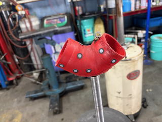 シリコンホーススライド式で装着出来る設計なので無理せず接続出来るようになる筈。スチールかエンジニアリング樹脂で製造します。